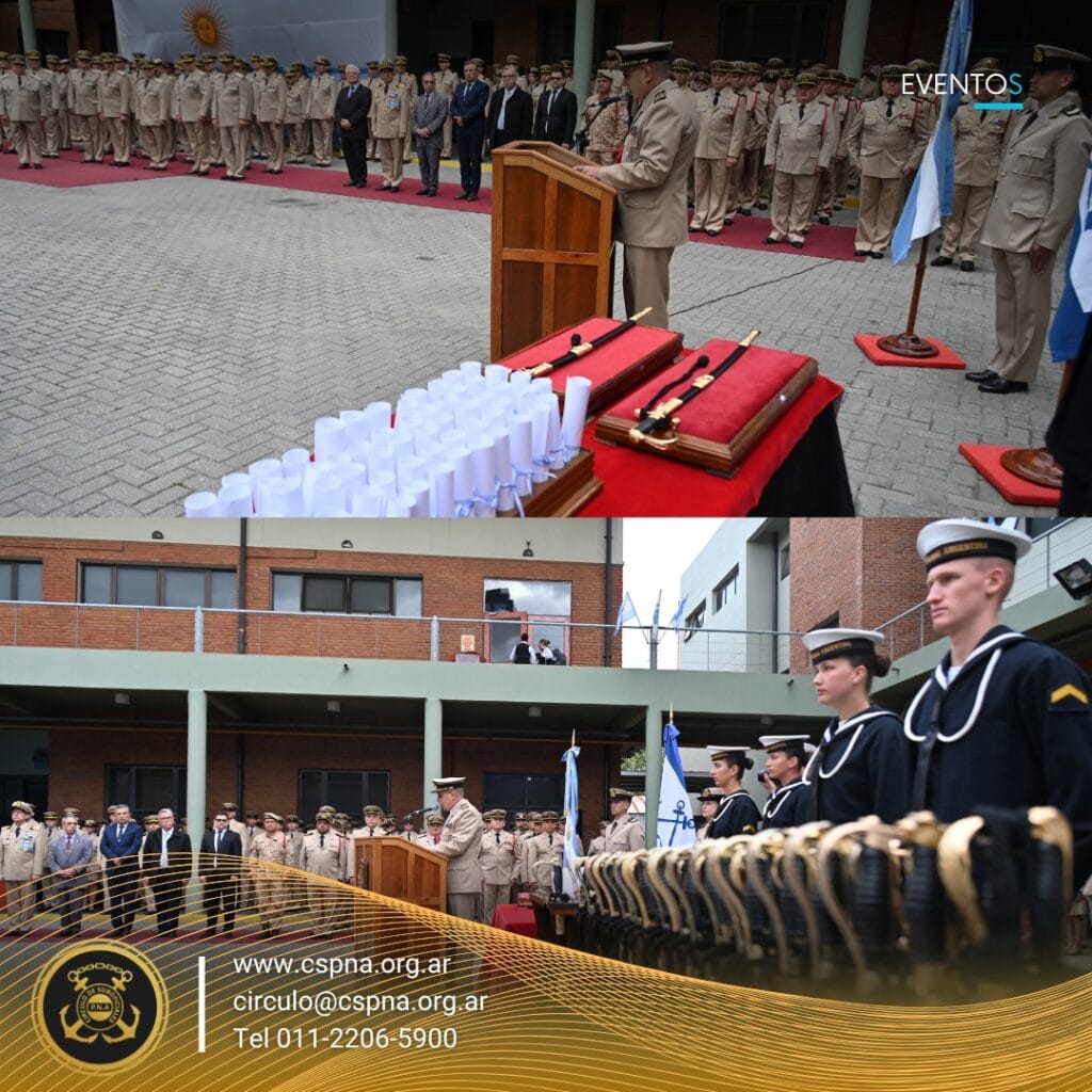 Tras la invocación religiosa a cargo del Capellán Castrense, Lucas Gabriel Martínez, quien bendijo las insignias y diplomas entregados, subrayando el valor espiritual que acompaña la vocación de servicio en la Prefectura Naval Argentina, se evocó el profundo significado del sable, símbolo que representa el honor, la disciplina y el espíritu de cuerpo del personal de Prefectura. Las palabras del Suboficial Encargado General destacaron el sacrificio, la entrega y la lealtad que caracterizan a cada uno de los ascendidos: “Este sable no es solo metal y empuñadura; en su brillo se refleja la historia, el compromiso y la vocación de servicio de quienes lo portan”.